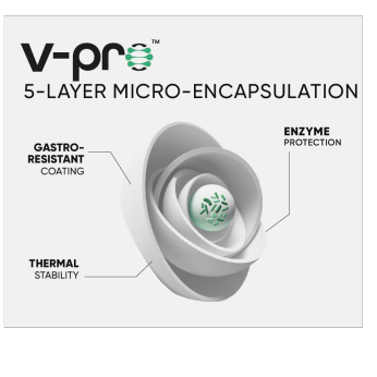 V-Pro™ — 5-Layer Micro-EncapsulationGastro-resistant coating · Enzyme protection · Thermal stability